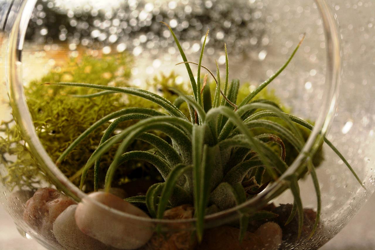 Air plants. Air plants are universal and can be included in DIY wall art, hung from the ceiling or on the wall inside geometric metal prisms, or placed inside beautiful glass terrariums alongside other plants and colorful rocks or sand.